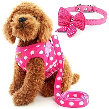 Cute Small Dog Harness Ladies Polka Dots Dog Vest Harness Set With Pink Leash And Bowknot Collar 3 In 1 Girl Style Vest Harness Set For Puppy And